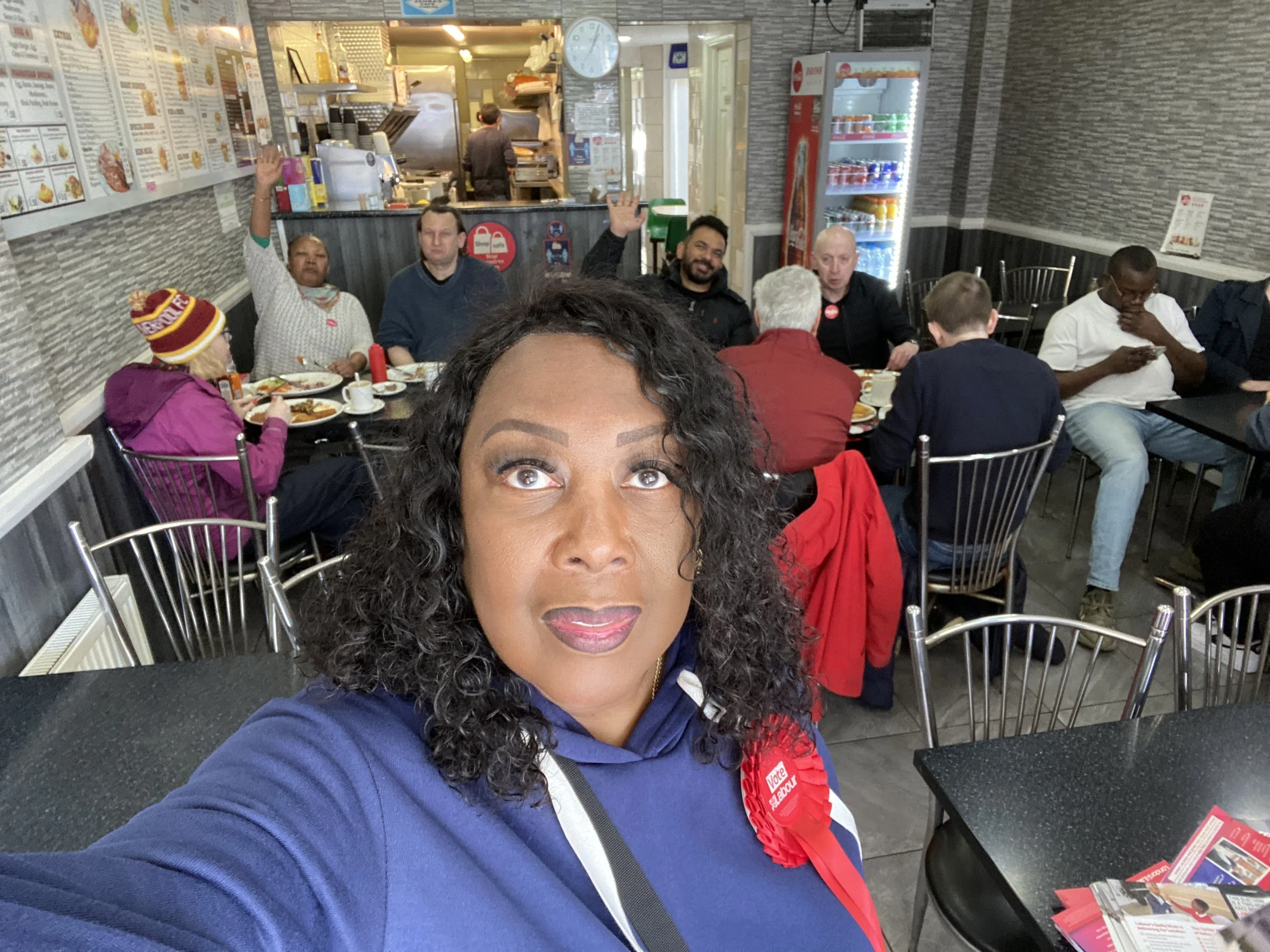 Cllrs Sandra Thomas, Issy Cooke, Averil Lekau, Matt Morrow and Anthony Okereke with some of our brilliant volunteers in Zehra’s Cafe, 39 Lakedale Road, London, SE18 1PR